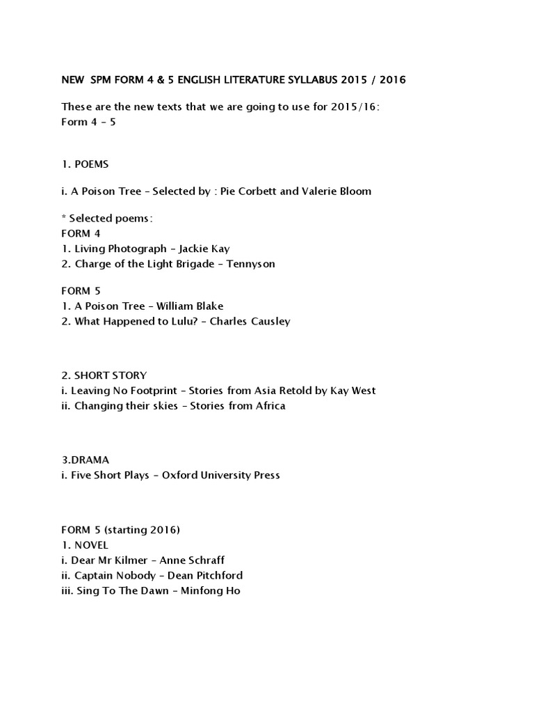 English Literature F4 And F5 2015 2016 Poetry Free 30 Day